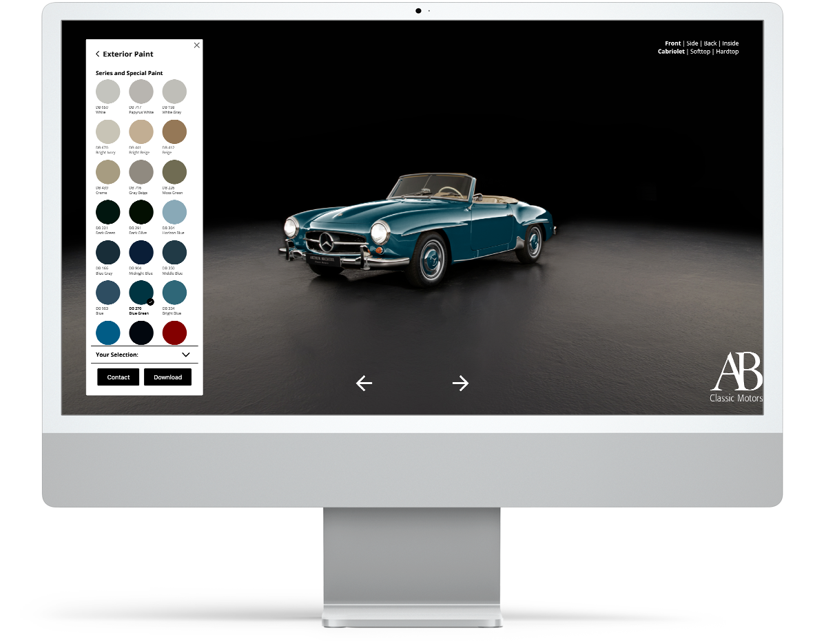Der Online-Konfigurator kann genau das. Zur Auswahl stehen Lackfarben, Felgen, Dachvarianten und auch das Sitzleder kann verändert werden. Dabei wird der SL so gezeigt, als wäre er in jeder Variation fotografiert worden. Wenn sich Interessenten ihren Traumwagen zusammengestellt haben, können sie unkompliziert den Oldtimer als Anfrage an Arthur Bechtel senden.